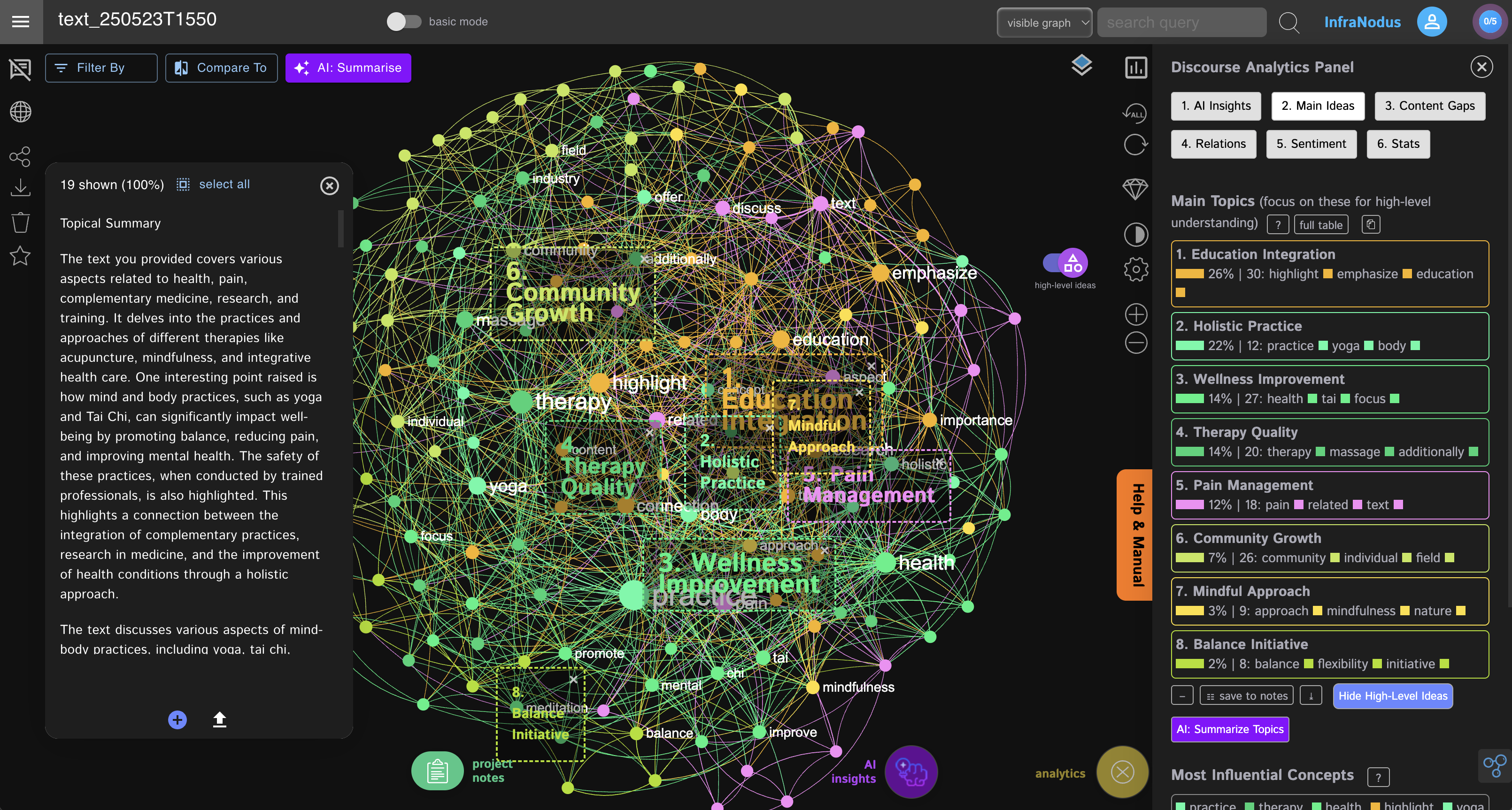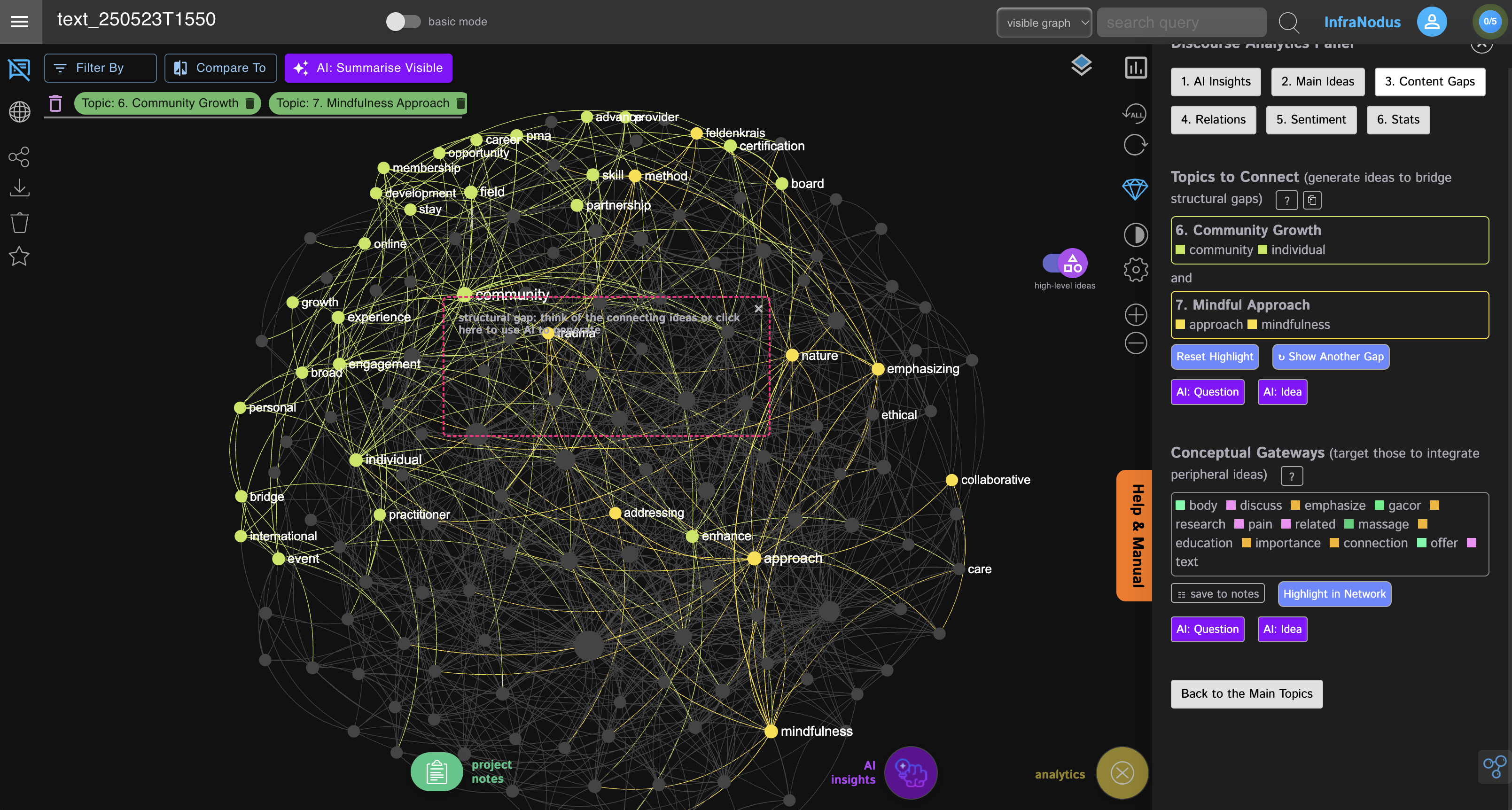 Insight generation (using InfraNodus to identify the main topical clusters and gaps in those summaries, these insights are then added to the Google sheet file.