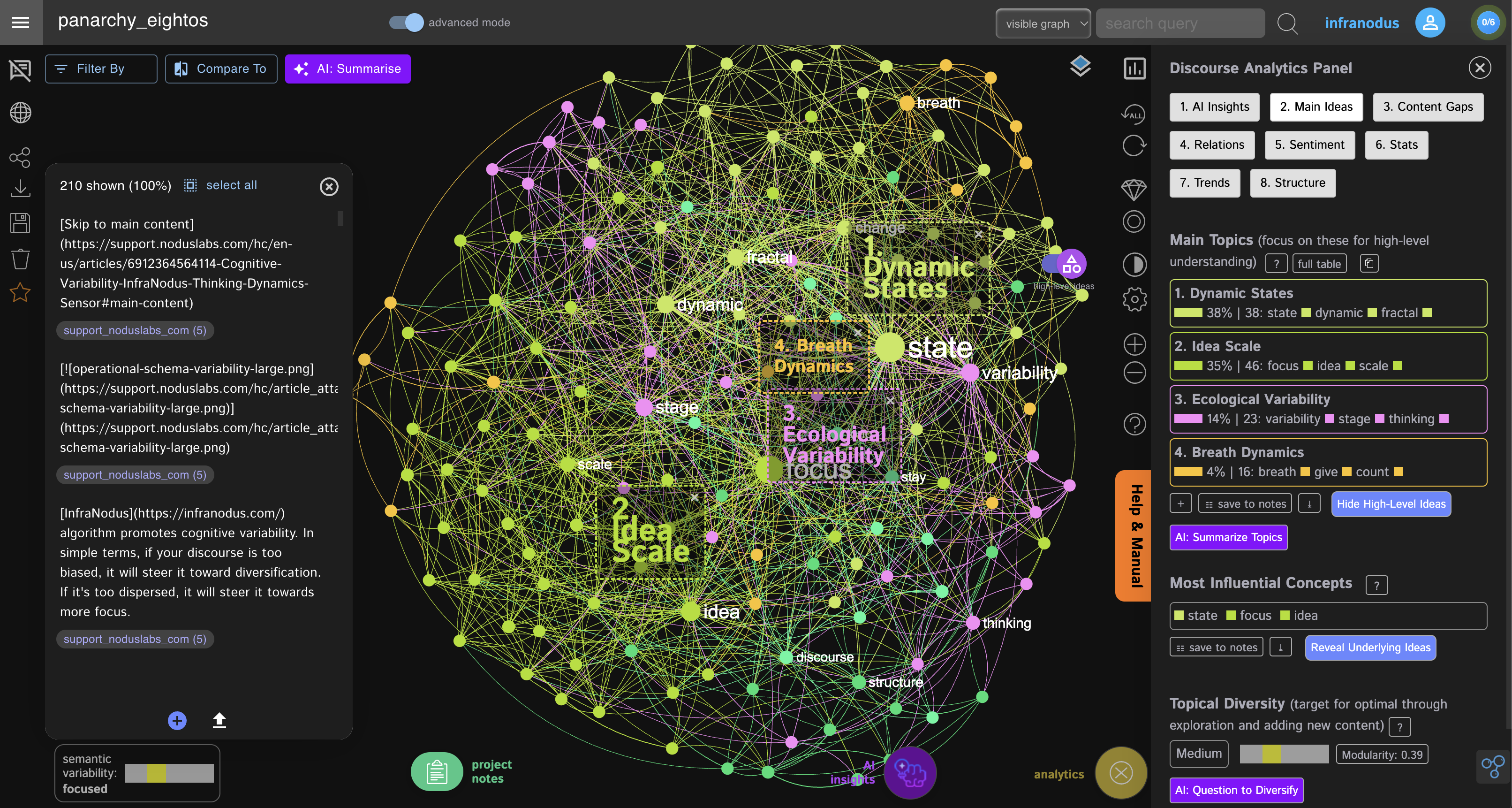 The knowledge base is provided using the InfraNodus GraphRAG with the knowledge graphs offering high-quality responses without the need to set up complex RAG vector store workflows.